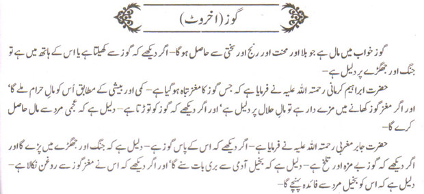 اخروٹ خواب میں مال ہے جو بلا اور محنت اور رنج اور سختی سے حاصل ہو گا۔ اگر دیکھے کہ گوز سے کھیلتا ہے یا اس کے ہاتھ میں ہے تو جنگ اور جھگڑے پر دلیل ہے۔ حضرت ابراہیم کرمانی رحمتہ اللہ علیہ نے فرمایا ہے کہ جس گوز کا مغز تباہ ہو گیا ہے۔ کمی اور بیشی کے مطابق اُس کو مال حرام ملے گا اور اگر مغز گوز کھانے میں مزے دار ہے تو مال حلال پر دلیل ہے اور اگر دیکھے کہ گوز کو توڑتا ہے۔ دلیل ہے کہ عجمی مرد سے مال حاصل کرے گا۔