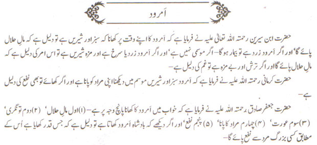 کہ امرود کا اپنے وقت پر کھانا کہ سبز اور شیریں ہے. تو دلیل ہے کہ مال حلال پائے گا. اور اگر امرود زرد ہے تو بیمار ہو گا۔ اگر موسمی نہیں ہے. اور اگر امرود زرد یا سرخ ہے اور مزہ شیریں ہے۔تو اس امر کی دلیل ہے کہ مال حلال پائے گا اور اگر ترش اور بے مزہ ہے تو غم کی دلیل ہے۔