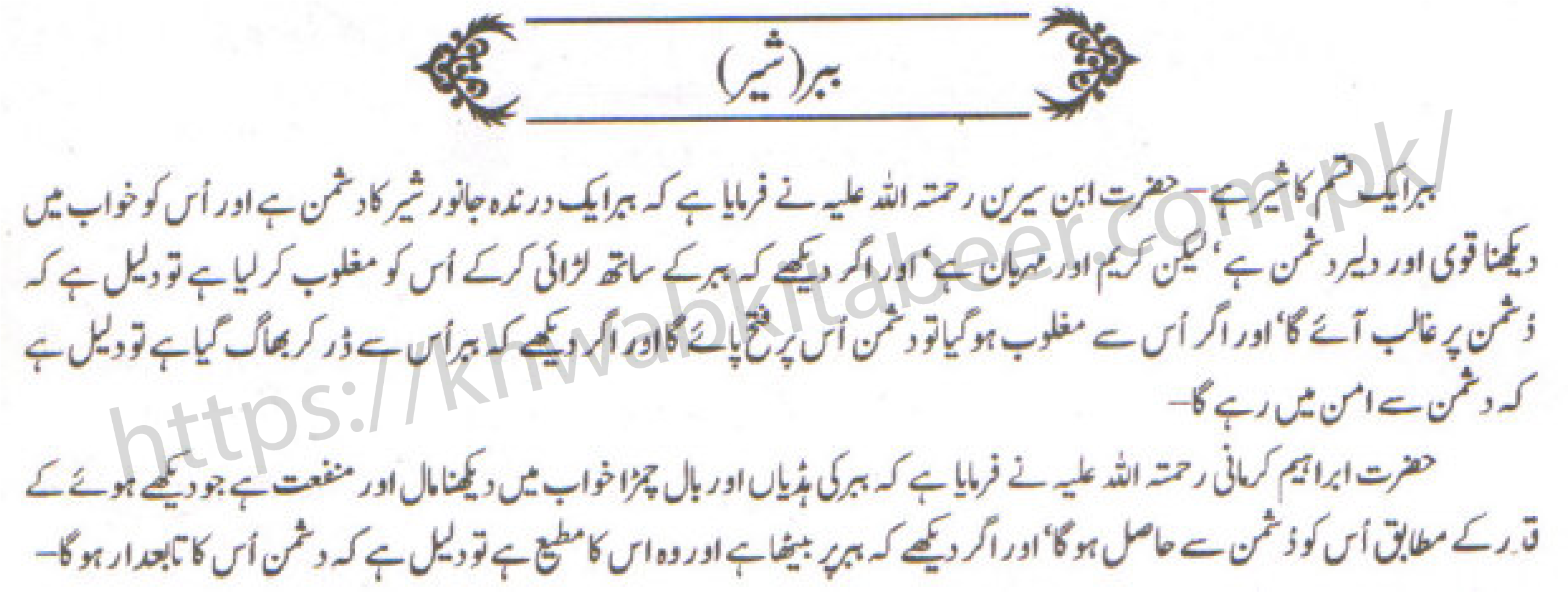 کہ ہر ایک درندہ جانور شیر کا دشمن ہے اور اُس کو خواب میں دیکھنا قوی اور دلیر دشمن ہے، لیکن کریم اور مہربان ہے اور اگر دیکھے کہ ہر کے ساتھ لڑائی کر کے اُس کو مغلوب کر لیا ہے تو دلیل ہے کہ دشمن پر غالب آئے گا اور اگر اس سے مغلوب ہو گیا تو دشمن اس پر فتح پائے گا اور اگر دیکھے کہ ببر اُس سے ڈر کر بھاگ گیا ہے تو دلیل ہے کہ دشمن سے امن میں رہے گا۔