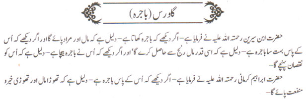حضرت ابن سیرین رحمتہ اللہ علیہ نے فرمایا ہے۔ اگر دیکھے کہ باجرہ کھاتا ہے۔ دلیل ہے کہ مال اور مراد پائے گا اور اگر دیکھے کہ اُس کے پاس بہت سا باجرہ ہے۔ اسی قدر مال رنج سے حاصل کرے گا اور اگر دیکھے کہ اُس نے باجرہ بیچا ہے۔ دلیل ہے کہ اُس کونقصان پہنچے گا۔