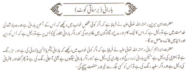 کہ اگر کوئی شخص خواب میں دیکھے کہ اُس کے جسم پر بارانی ہے اور وہ بادشاہ کی خدمت میں ہے تو دلیل ہے کہ اس کا نیک کام اور مرح و مثالوگوں میں ظاہر ہوگی اور اگر بارانی بطور کپڑا اس پر ہے تو دلیل ہے کہ اس کو دین اور دُنیا میں فائدہ حاصل ہو گا۔