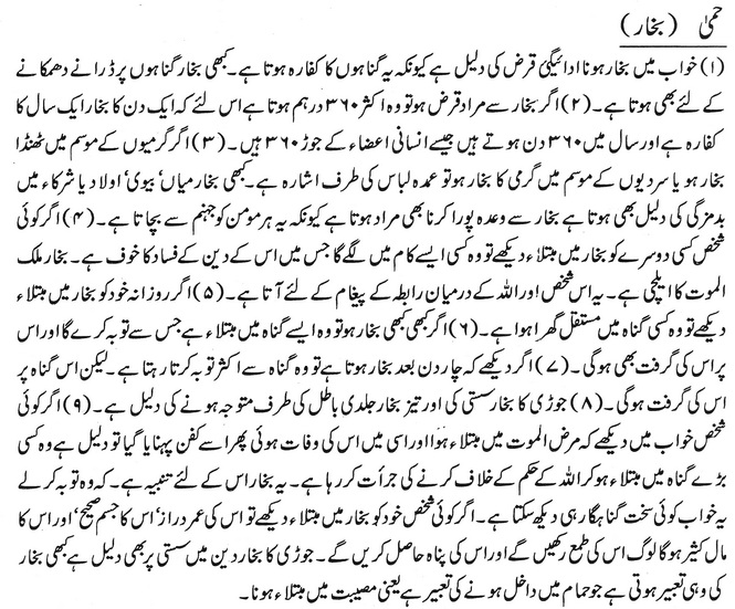 کہ اگر کوئی خواب میں دیکھے کہ اس کو  بخار تھا کہ ایک پل بھی جدا نہیں ہو تا ہے تو دلیل ہے کہ۔ ہمیشہ فساد اور گناہ میں مبتلا رہے گا۔ تو بہ کرنی چاہئے تا کہ عذاب سے نجات پائے۔