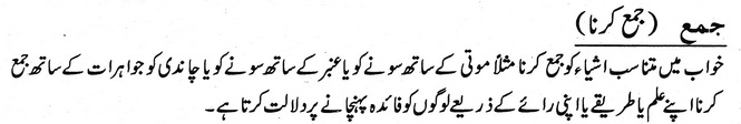 خواب میں متناسب اشیاء کو جمع کرنا مثلاً موتی کے ساتھ سونے کو یا عنبر کے ساتھ سونے کو یا چاندی کو جواہرات کے ساتھ جمع کرنا اپنے علم یا طریقے یا اپنی رائے کے ذریعے لوگوں کو فائدہ پہنچانے پر دلالت کرتا ہے۔