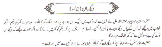 حضرت ابن سیرین رحمتہ اللہ علیہ نے فرمایا ہے کہ خواب میں دیگ دان دو وجہ پر ہے۔ ایک گھر کا مالک۔ دوسرے گھر کی بیگم