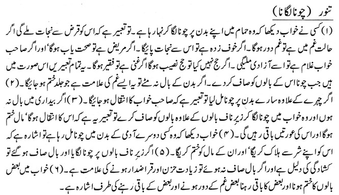 اگر بیداری میں بال نہ ہوں اور وہ خواب میں چونا لگا کر زیر ناف بالوں کے علاوہ بالوں کو صاف کرے تو تعبیر یہ ہے کہ اس کا انتقال ہو گا، مال ختم ہوگا اور اس کی عورتیں باقی رہیں گی ۔