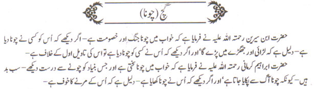 حضرت ابن سیرین رحمتہ اللہ علیہ نے فرمایا ہے کہ خواب میں چونا جنگ اور خصومت ہے۔