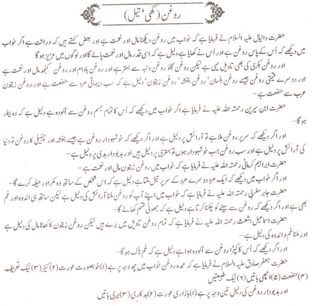 اگر خواب میں دیکھے کہ اُس کے پاس گھی ہے اور اُس نے کھایا ہے دلیل ہے کہ۔ اس قدر مال اور نعمت پائے گا اور لوگوں میں عزیز ہو گا۔ اور روغن بکری کی بھی تاویل یہی ہے لیکن روغن گاؤ روغن دنبہ سے بہتر ہے اور روغن بادام اور روغن کنجد مال اور نعمت ہے سرے قیمتی روغن جیسے روغن بلسان روغن بنفشه روغن زیتون، دلیل ہے کہ سب دیہاتی مرد سے منفعت ہے اور روغن زیتون  عرب سے منفعت ہے۔