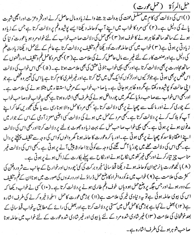 خواب میں کسی حاملہ عورت کو دیکھنا غم و تکلیف پر دلالت کرتا ہے۔ عالم کے لئے حمل دیکھنا زیا دت علم کی دلیل ہے اور صنعت کار کے لئے غیر سے مال حاصل کرنے کی علامت ہے ۔