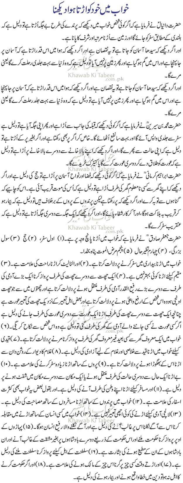 اپنے وطن کی طرف آنے کی دلیل ہے۔ اور بقول بعض یہ خواب بھی کثرت سفرکرنے کی علامت ہے۔ (۱۲) خواب میں پرندوں کے ساتھ اڑ نا مسافروں کے ساتھ مصاحبت کی دلیل ہے۔ (۱۳) لالچی آدمی کے لئے اڑنے کی کوئی اچھی تعبیر نہیں ہے۔ (۱۴) خواب میں کسی انسان کے ساتھ اڑنے میں مقابلہ کرنا اس سے آگے نکلنا اس پر غالب آنے کی دلیل ہے۔ اور آگے نکلنے والا رفیع انسان ہوگا۔ (۱۵) پہاڑوں کے اوپر پرواز کرنا حکومت ملنے۔ اور اس حکومت کے ذریعے دوسرے بادشاہوں پر بغیر مشقت کے غالب آنے۔ اور ان بادشاہوں کے ان کے مطیع ہونے کی بشارت ہے۔