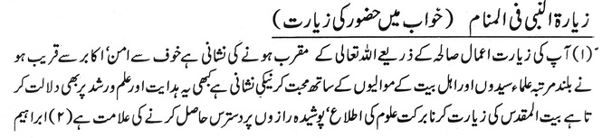 آپﷺ کی زیارت اعمال صالحہ کے ذریعے اللہ تعالی کے مقرب ہونے کی نشانی ہے خوف سے امن، اکابر سے قریب ہو نے بلند مرتبہ علماء سیدوں اور اہل بیت کے موالیوں کے ساتھ محبت کر نیکی نشانی ہے کبھی یہ ہدایت اور علم ورشد پر بھی دلالت کر تا ہے بیت المقدس کی زیارت کرنا برکت علوم کی اطلاع پوشیدہ رازوں پر دسترس حاصل کرنے کی علامت ہے