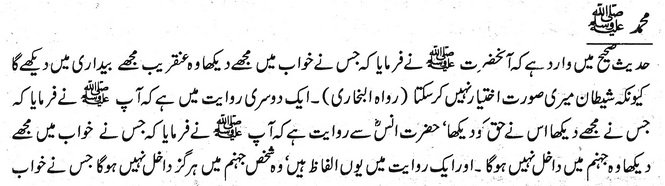 آنحضرت صلى الله عليه وسلم نے فرمایا کہ جس نے خواب میں مجھے دیکھا وہ عنقریب مجھے بیداری میں دیکھے گا کیونکہ شیطان میری صورت اختیار نہیں کر سکتا ( رواہ البخاری)۔