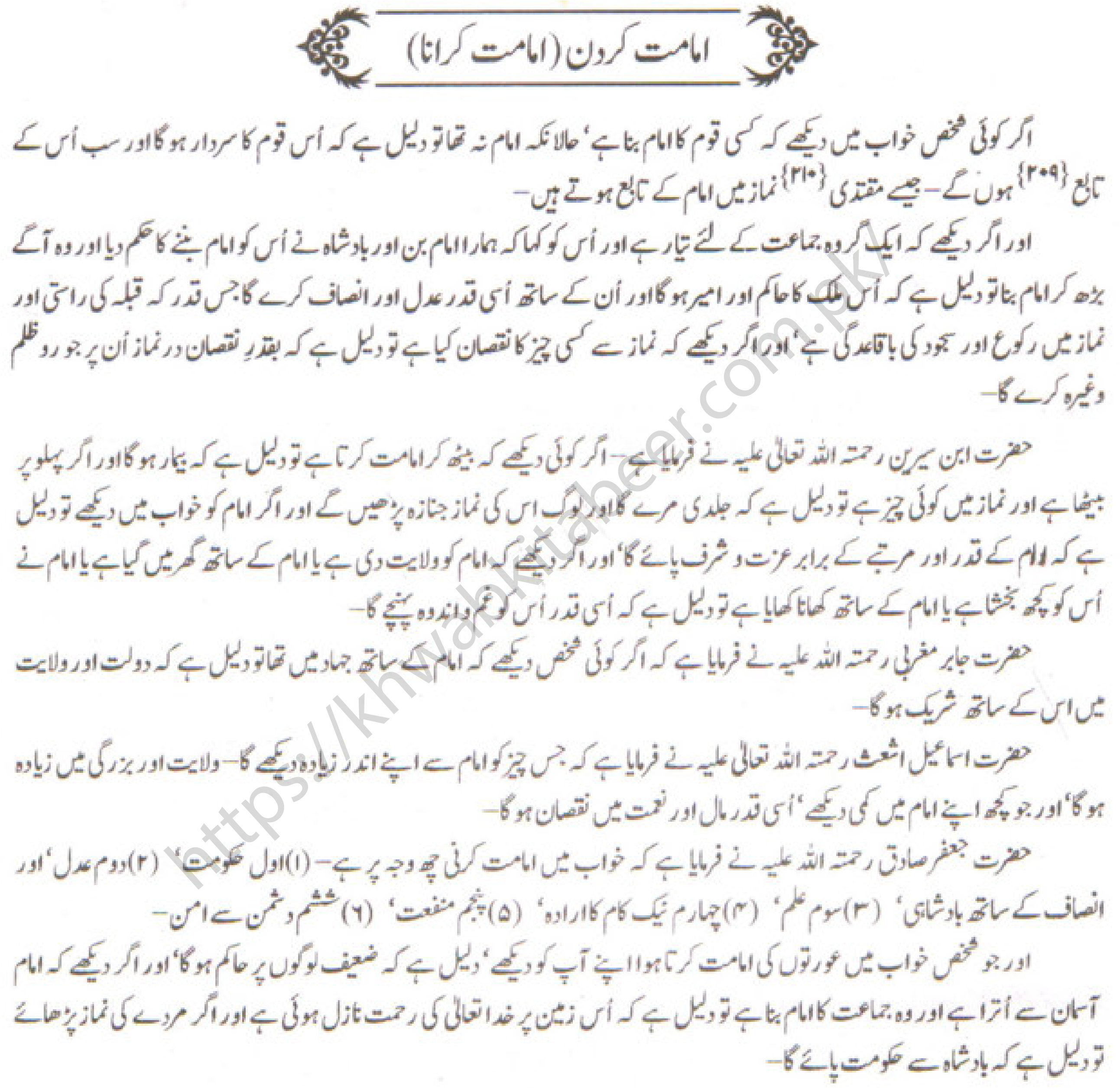 حضرت جعفر صادق رحمتہ اللہ علیہ نے فرمایا ہے کہ خواب میں امامت کرنی چھ وجہ پر ہے۔