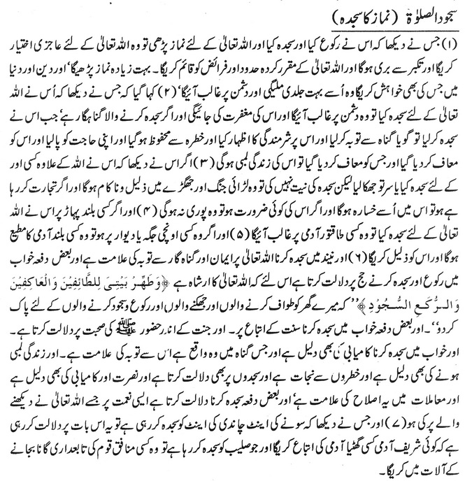اور بعض دفعہ خواب میں سجدہ کرنا سنت کے اتباع پر ۔ اور جنت کے اندر حضور علیہ کی صحبت پر دلالت کرتا ہے۔ خواب میں سجدہ کرنا کامیابی کا بھی دلیل ہے۔ اور جس گناہ میں وہ واقع ہے اس سے تو بہ کی علامت ہے۔ زندگی لمبی ہونے کی بھی دلیل ہے اور خطروں سے نجات ہے۔