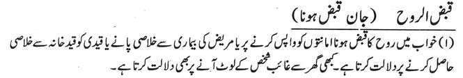خواب میں روح کا قبض ہونا امانتوں کو واپس کرنے پر یا مریض کی بیماری سے خلاصی پانے یا قیدی کو قید خانہ سے خلاصی حاصل کرنے پر دلالت کرتا ہے۔