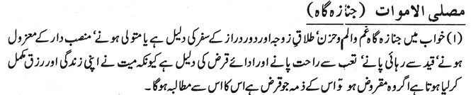 خواب میں جنازہ گاہ غم والم وحزن طلاق زوجہ اور دور دراز کے سفر کی دلیل ہے یا متولی ہونے، منصب دار کے معزول ہونے قید سے رہائی پانے، تعب سے راحت پانے اور ادائے قرض کی دلیل ہے کیونکہ میت نے اپنی زندگی اور رزق مکمل کر لیا ہوتا ہے اگر وہ مقروض ہو تو اس کے ذمہ جو قرض ہے اس کا اس سے مطالبہ ہو گا۔