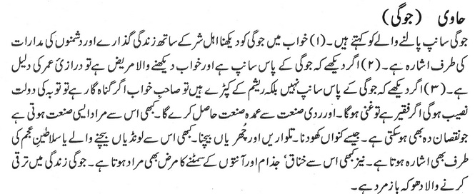 اگر دیکھے کہ جوگی کے پاس سانپ ہے اور خواب دیکھنے والا مریض ہے تو درازی عمر کی دلیل ہے۔