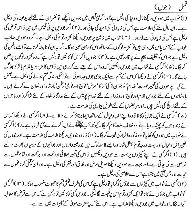 خواب میں جو ویں دیکھنا مال و دنیا کی دلیل ہے اور اگر نئی قمیص میں جو ویں دیکھے تو حکمران کے لئے تجدید عہدہ کی دلیل ہے۔ یا ایسا مال ملنے کی علامت ہے جس کی زیادتی کی امید کی جاتی ہو۔