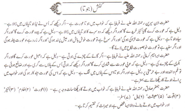 اور اگر دیکھے کہ دوسرے کا جو تا پاؤں میں ڈالا ہے۔ دلیل ہے کہ بیوہ عورت کرے گا اور اگر سیاہ جوتا ہے۔ دلیل ہے کہ عورت لڑکی ہوگی۔