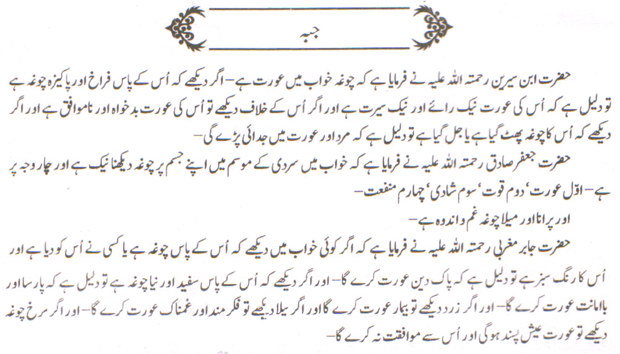 کہ جُبہ خواب میں عورت ہے۔ اگر دیکھے کہ اُس کے پاس فراخ اور پاکیزہ جُبہ ہے تو دلیل ہے کہ۔ اُس کی عورت نیک رائے اور نیک سیرت ہے اور اگر اُس کے خلاف دیکھے۔ تو اُس کی عورت بد خواہ اور ناموافق ہے۔