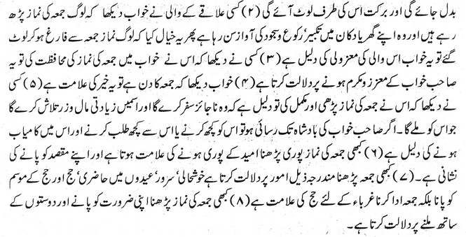 کسی نے دیکھا کہ اس نے خواب میں جمعہ کی نماز کی محافظت کی تو یہ صاحب خواب کے معزز و مکرم ہونے پر دلالت کرتا ہے۔
