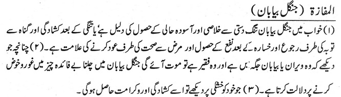 خواب میں جنگل بیابان تنگ دستی سے خلاصی اور آسودہ حالی کے حصول کی دلیل ہے۔ یا تنگی کے بعد کشادگی اور گناہ سے تو بہ کی طرف رجوع اور خسارہ کے بعد نفع کے حصول اور مرض سے صحت کی طرف عود کر نے کی علامت ہے۔ چنانچہ جو دیکھے کہ وہ ویران یا بیابان جگہ میں ہے اور وہ فقیر ہے تو موت آئے گی جنگل بیابان میں چلنا بے فائدہ چیز میں غور و خوض