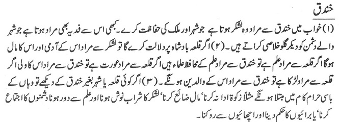 خواب میں خندق سے مراد وہ لشکر ہوتا ہے جو شہر اور ملک کی حفاظت کرے۔ کبھی اس سے فدیہ بھی مراد ہوتا ہے جو شہر والے دشمن کو دیکر گلو خلاصی کراتے ہیں ۔