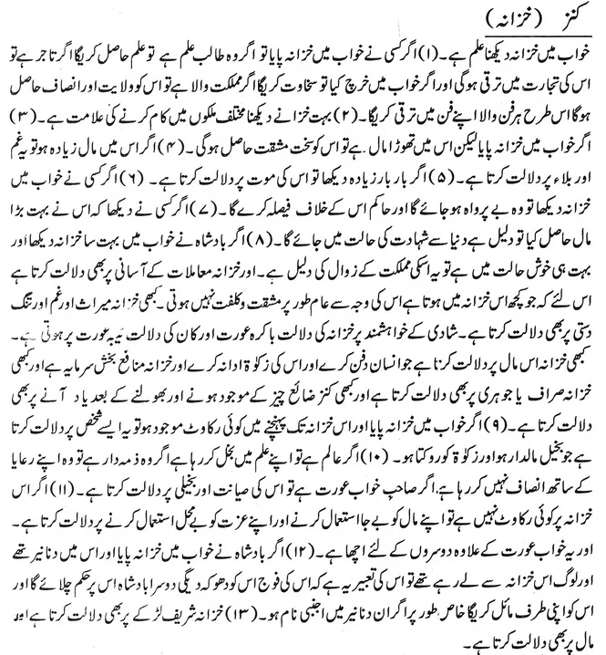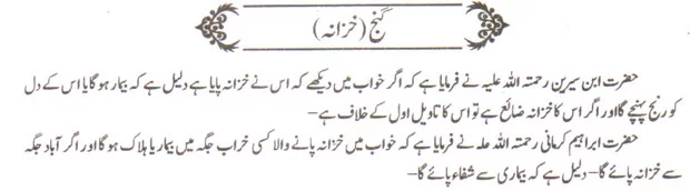 کہ خواب میں خزانہ پانے والا کسی خراب جگہ میں بیمار یا ہلاک ہو گا۔ اور اگر آباد جگہ سے خزانہ پائے گا۔ دلیل ہے کہ بیماری سے شفاء پائے گا۔
