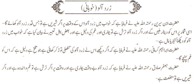 حضرت ابن سیرین رحمتہ اللہ علیہ نے فرمایا ہے کہ خواب میں زرد آلو اس کے وقت پر اگر شیریں ہے تو جس قدر زرد آلو کھائے گا۔ اسی شمار پر اس کو دینار ملیں گے اور اگر زرد آلو ترش ہے تو بیماری اور غم کی دلیل ہے اور بعض اہل تعبیر نے بیان کیا ہے کہ خواب میں زرد آلو کو دیکھنا کنیر یا مال ہے۔