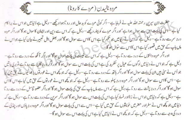 دلیل ہے کہ اس سے غیبت کی بابت سوال ہو گا اور اگر آنکھ کے درد سے روتا ہے۔ دلیل ہے کہ جو اس نے دنیا میں۔ لوگوں کے عیال پر نظربد کی ہے اس کی بابت اس سے سوال ہو گا۔ اور اگر درد کان سے روتا ہے تو بری باتیں جو اس نے سنی ہیں ان کی بابت سوال ہو گا اور اگر ہاتھ کے درد سے روتا ہے۔ دلیل ہے کہ جو کچھ اس نے عورتوں یا بھائیوں کے حق میں کیا ہے۔ اس کا اس سے سوال ہو گا اور اگر مرده در د پہلوسے روتا ہے۔ دلیل ہے کہ جو کچھ اس نے عورتوں کے حق میں کیا ہے اس کا اس سوال ہو گا