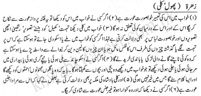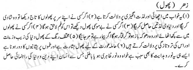 دلیل ہے کہ کسی دختر کو نکاح میں لائے گا۔ اور اگر اپنے گھر میں گل صد برگ کو دیکھے۔ دلیل ہے کہ فرزند کے سبب سے خوش ہو گا۔اور اگر کئی طرح کے پھول کھلے ہوئے دیکھے۔ دلیل ہے کہ اپنے خویشوں اور اہل بیت سے خوش ہو گا۔ اور اگر درخت گل کی جڑ زمین سے اگی ہوئی دیکھے۔ دلیل ہے کہ اس کے گھر کے لوگ کاہل ہوں گے۔ حضرت جابر مغربی رحمۃ اﷲعلیہ نے فرمایا کہ خواب میں پھول کم ہمت اور بد عہد شخص ہے جو کسی سے وفا نہیں کرتا ہے۔ اور اگر دیکھے کہ کسی کو پھول دیا ہے یا ہاتھ سے گرایا ہے۔ دلیل ہے کہ ایسے بے وفا شخص کی صحبت سے دور ہو گا۔