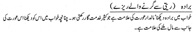 خواب میں برادہ دیکھنا، مالدار عورت کی علامت ہے جو کثیر خدمت گار رکھتی ہو۔ چنانچہ خواب میں اس کو دیکھنا اس عورت کی جانب سے مال ملنے کی علامت ہے۔