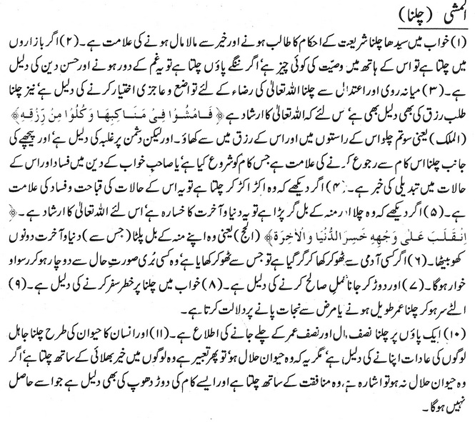میانہ روی اور اعتدال سے چلنا اللہ تعالیٰ کی رضاء کے لئے تواضع و عاجزی اختیار کرنے کی دلیل ہے نیز چلنا طلب رزق کی بھی دلیل بھی ہے اس لئے کہ اللہ تعالیٰ کا ارشاد ہے فَامْشُوا فِي مَنَاكِبِهَا وَكُلُوا مِنْ رِزْقِهِ (الملک) یعنی سو تم چلو اس کے راستوں میں اور اس کے رزق میں سے کھاؤ۔ اور لیکن دشمن پر غلبہ کی دلیل ہے اور پیچھے کی جانب چلنا اس کام سے رجوع کرنے کی علامت ہے۔ جس کام کو شروع کیا ہے یا صاحب خواب کے دین میں فساد اور اس کے حالات میں تبدیلی کی خبر ہے۔
