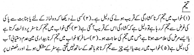خواب میں عدم دستیابی آب کی وجہ سے تیم کرنا خوشحالی قریب ہونے کی علامت ہے اور پانی کی موجودگی میں تیمم کرنے میں پانچ اقوال ہیں ۔