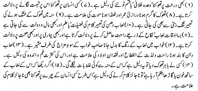 لعاب دہن کا بند ہونا راحت ولذت کے انقطاع اور فقدان اولاد کی علامت ہے اور اس کی کثرت غم واندوہ کی دلیل ہے۔
