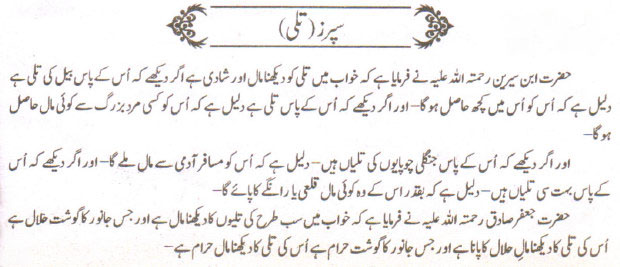 کہ خواب میں سب طرح کی تلیوں کا دیکھنا مال ہے اور جس جانور کا گوشت حلال ہے اس کی تلی کا دیکھن مال حلال کا پاتا ہے اور جس جانور کا گوشت حرام ہے اُس کی تلی کا دیکھنا مال حرام ہے۔